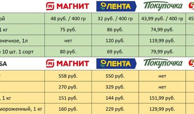 Вполне себе стабильными в сравнении с другими продуктами остались мясо и рыба. Самую дешёвую свинину продают в «Магните» и «Пятёрочке» (270 и 280 руб. за кг соответственно), а на тушку курицы во всех 4 торговых сетях ценники отличаются незначительно (от 144 до 160 руб/кг). А вот цена на замороженный минтай колеблется прилично — от 130 руб/кг («Покупочка») до 283 руб/кг («Пятёрочка»).
