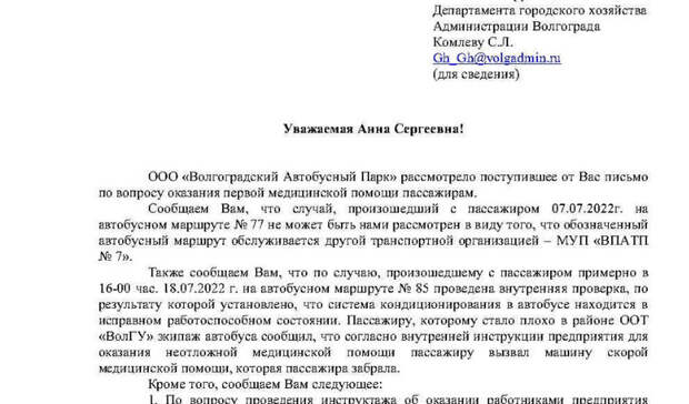 С вопросом об оказании первой медицинской помощи пассажирам автобусов исполнительный директор ВРОО «Многодетный Волгоград» Анна Апакова обратилась в Волгоградский автобусный парк (ООО «ВАП»). Поводом для письма послужили жалобы многодетных волгоградцев, что в салонах в жару не работают кондиционеры, и людям становится плохо.